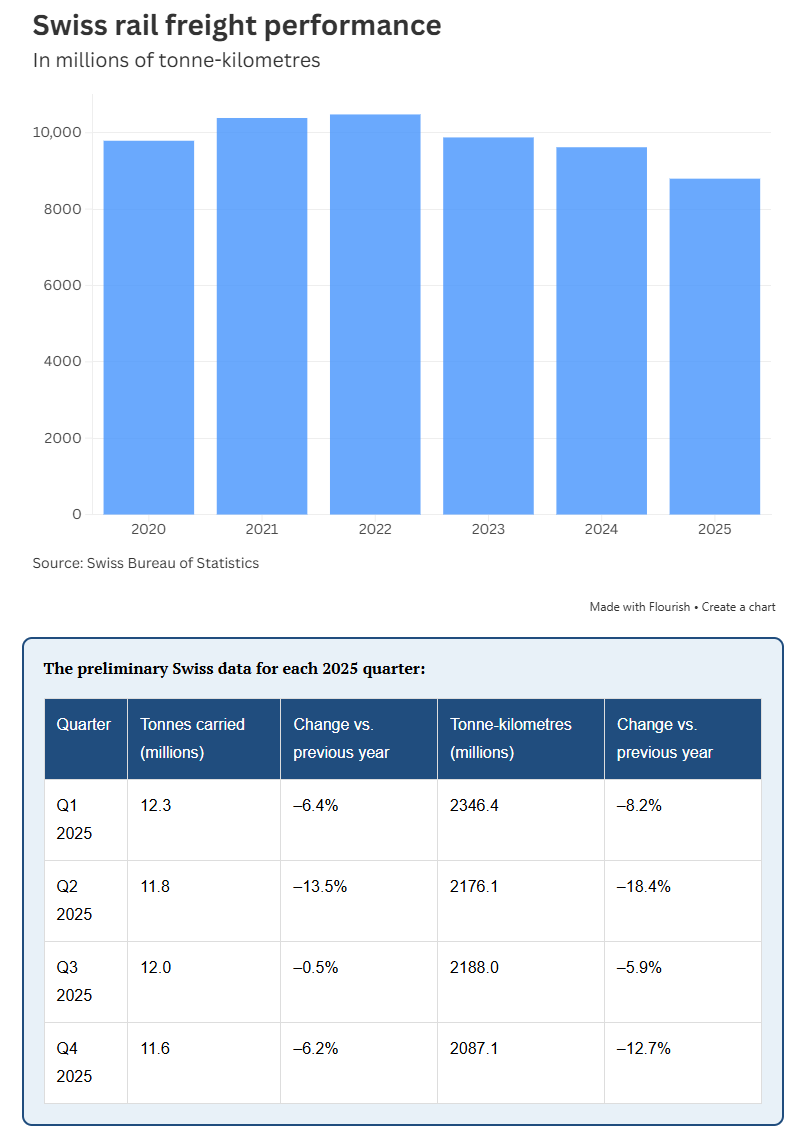 The modal share of transalpine rail freight in Switzerland fell below 70% for the first time since the mid-2010s, reaching 68.6% in 2025. “The ongoing decline in transalpine rail freight traffic is due to poor quality and reliability along Europe’s north-south routes”, the Swiss government said earlier.